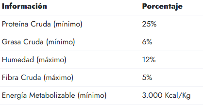 Ingredientes: Harina de Trigo, Harina de Pollo y Harina de Carne y Hueso Bovina, Maíz, Arroz, Soya, Hidrolizado de Proteínas Animales (Saborizante Natural), Aceite Refinado de Ave y Ácidos Grasos Marinos Ricos en Omega 3 y 6 estabilizados con Antioxidantes Naturales (Tocoferoles y Extracto de Romero), Extracto de Levadura Fuente de Manano Oligosacáridos (MOS), Extracto de Yucca schidigera, Zeolitas, L-Carnitina, DHA, Nucleótidos, Vitaminas (A, D, E, C, B1 Tiamina, B2 Riboflavina, B3 Niacina, B5 Ácido Pantoténico, B6 Piridoxina, B9 Ácido Fólico, B12 Cianocobalamina, Biotina y Colina), Minerales (Calcio, Fósforo, Potasio, Magnesio, Cobre Orgánico, Yodo, Hierro Orgánico, Manganeso Orgánico, Selenio Orgánico y Zinc Orgánico), Cloruro de Sodio (2,5 g/Kg), Conservantes y Antioxidantes (BHT, BHA, Ácido Cítrico, Propionato Cálcico, Propionato Sódico, Dióxido de Silicio y Aceite de Limón).