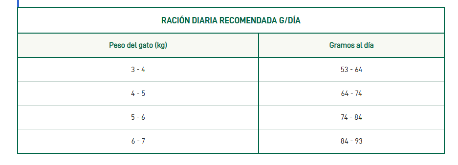 Componentes Analíticos: proteína bruta 31,5%, grasa bruta 16,5%, ácidos grasos Omega-6 2,7%, ácidos grasos Omega-3 0,7%, fibras brutas 2,3%, ceniza bruta 7,2%, calcio 1,3%, fósforo 1,1%, magnesio 0,1%, humedad 9%.