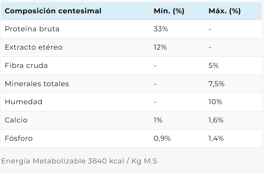 INGREDIENTES:Harina de vísceras de pollo, harina de carne y hueso bovino, gluten de maíz, arroz, concentrado proteico de soja, trigo, arvejas, aceite de pollo y/o grasa vacuna, maíz, pulpa de remolacha (fuente de fructooligosacáridos), hidrolizado de hígado porcino, levadura de cerveza, aceite de pescado, extracto de Yucca schidigera, lisina, metionina, colina, taurina, sal, zeolita, celulosa en polvo, bisulfato de sodio, cloruro de potasio, sorbato de potasio, extracto de romero, lecitina, tocoferoles, BHT, BHA, ácido cítrico. Vitaminas: A, C, D3, E, K3, B1, B2, B6, B12, ácido fólico, ácido nicotínico, ácido pantoténico, biotina. Minerales: hierro, cobre, zinc, selenio, manganeso, yodo, calcio.