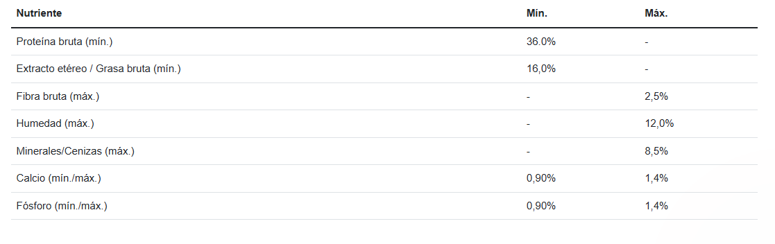 Ingredientes:Carne de pavo congelada, maíz, harina de subproductos de pollo, gluten de maíz, arroz, aceite de pollo y/o grasa vacuna preservados con tocoferoles (fuente de vitamina E), trigo, hidrolizado (polvo y/o liquido) a base de subproductos de pollo y/o cerdo, aceite de pescado, inulina, sal, harina de pescado y/o harina de alga (Schizochytrium sp.), cloruro de potasio, gluten de trigo, ácido fosfórico y/o bisulfato de sodio, carbonato cálcico y/o fosfato cálcico, L-lisina, pirofosfato tetrasódico, suplemento vitamínico antioxidante (A, D3, E, K3, B1, B2, B3, B5, B6, B7, B9, B12, BHT), cloruro de colina, suplementos minerales [(sulfatos: zinc, hierro, manganeso, cobre), (proteinatos: zinc, hierro, manganeso, cobre, selenio), yodato de calcio, selenito de sodio], taurina, levadura seca (Saccharomyces cerevisiae ssp.), ácido ascórbico (fuente de vitamina C), probiótico (Bacillus coagulans), DL-metionina.
