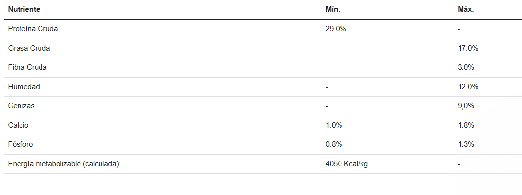 suplementos minerales [(sulfatos: zinc, hierro, manganeso, cobre, magnesio), (proteinatos: zinc, hierro, manganeso, cobre, selenio), yodato de calcio, selenito de sodio], levadura seca (Saccharomyces cerevisiae ssp.), L-lisina, DL-metionina, taurina, ácido ascórbico (fuente de vitamina C).