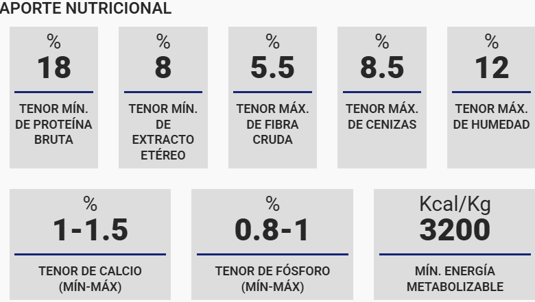 Ingredientes: Maíz, arroz, harina de carne bovina, harina de soja, harina de vísceras de pollo, poroto alubia, harina de sangre bovina, semita, afrechillo de trigo, aceite de pollo, saborizante: hidrolizado de hígado de pollo, núcleo vitamínico mineral (Vitaminas: A, D3, E, K, B1, B2, B6, B12, Zinc, Hierro, Ácido nicotínico, Acido Pantoténico, Cobre, Manganeso, lodo, Ácido Fólico, Biotina, Selenio, Antifúngico (propionato de calcio), Antioxidante (BHT/BHA).
