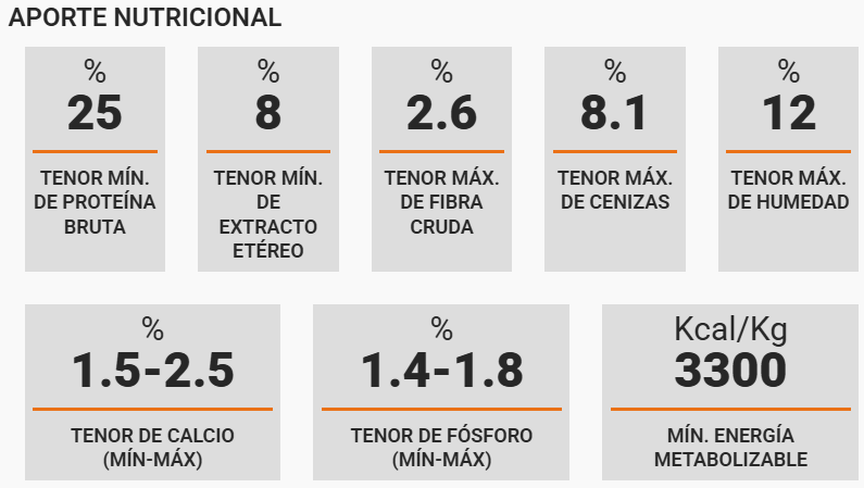 Ingredientes: Maíz, soja, pellets de soja, harina de carne y huesos bovinos, hidrolizado de vísceras porcinas, vacunas y aviares (saborizante), gluten meal, aceite de pollo, leche en polvo, propionato de calcio, secuestrante de micotoxinas (montmorillonita beneficiada en proceso físico-químico), cloruro de colina, BHT/BHA, sulfato de zinc, sulfato ferroso, ácido nicotínico, ácido fólico, sulfato de cobre, pantotenato de calcio, óxido de manganeso, iodado de calcio, Vitaminas: A, D3, E, K3, B1, B2, B6, B12-selenito de sodio, biotina.